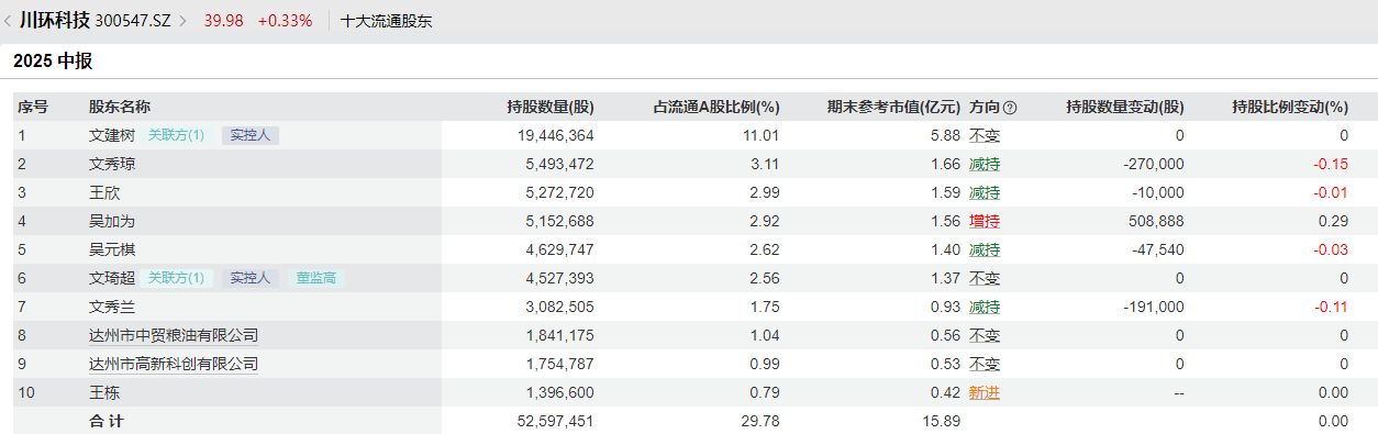 半年报显示,截至2025年6月30日,相较于今年一季报,川环科技十大流通股东发生了变化:王栋新进,摩根士丹利数字经济混合型证券投资基金退出,吴加为增持约50.89万股,文秀琼、王欣、吴元棋和文秀兰四人合计减持约51.85万股。