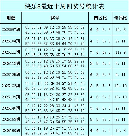 福彩快乐8第2025160期(上周四)开奖回顾:01 04 17 19 26 27 31 35 42 45 46 47 52 57 60 61 67 69 72 80,其中奖号四区比为4:4:7:5,奇偶比为12:8。